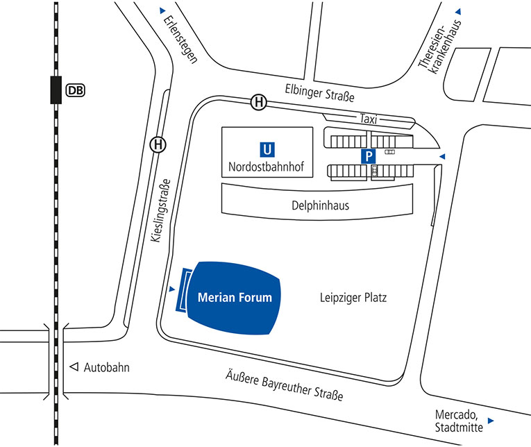 Die U-Bahn und Bushaltestellen Nordostbahnhof befinden sich direkt neben dem Merian Forum.